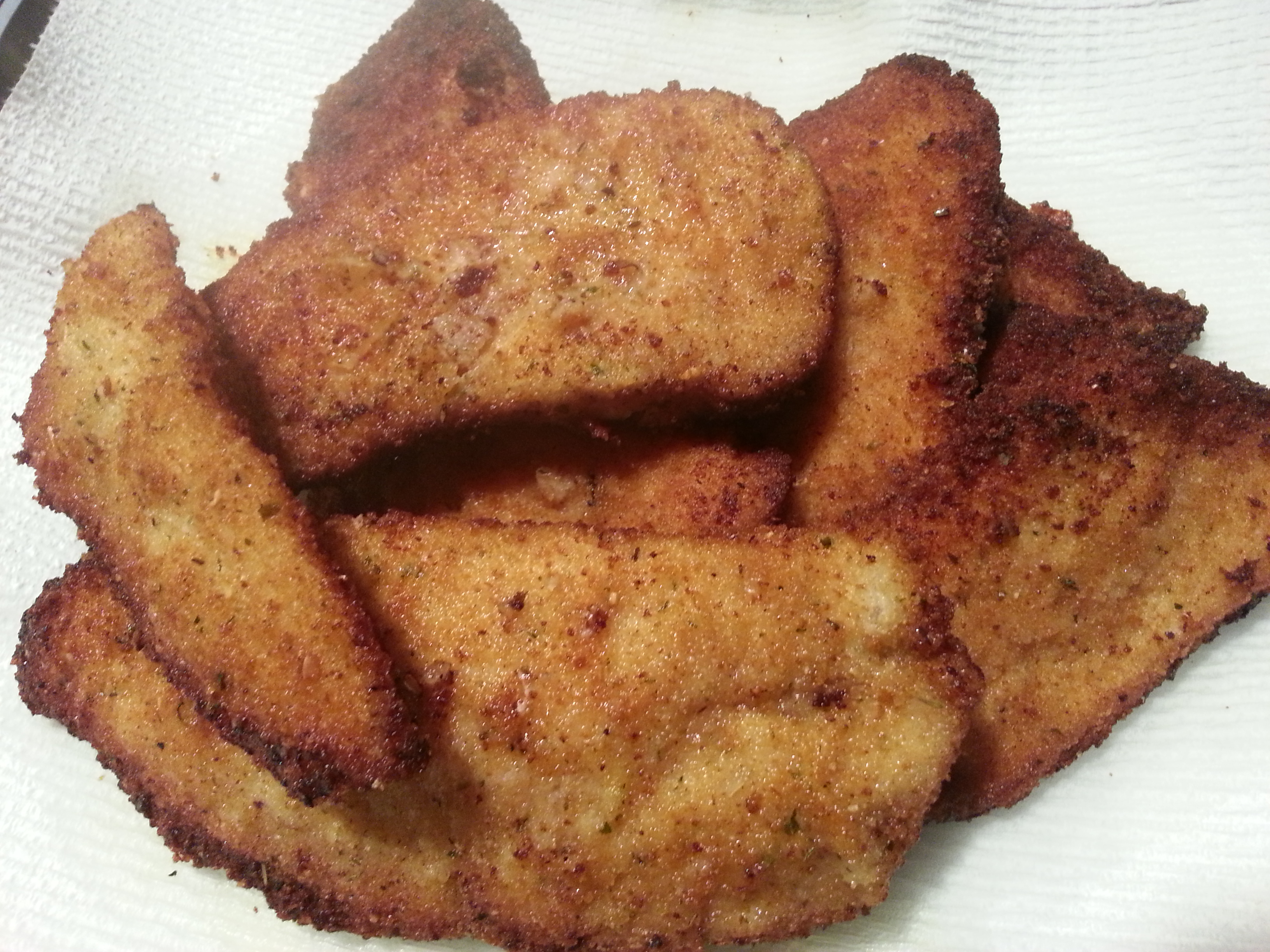 Thin the chicken breast by slicing them in half. Put the thinned chicken breast in a bowl and cover them with Buttermilk. Let stand for ½ hour or more. This will tenderize the chicken.Meanwhile, in a shallow bowl combine the eggs, water, salt and pepper. Whisk together until the mixture is completely combined.Pour the breadcrumbs in a separate shallow bowl and add salt, pepper and grating cheese. Heat the oil in a heavy bottom skillet. Rinse the chicken cutlets to remove most of the buttermilk. Dredge the cutlets in the egg mixture first, then in the breadcrumb mixture completely coating the them. Cook the cutlets for 10 minutes on each side. They may require additional or less cooking time depending on the thickness of the cutlets. Don’t crowd the skillet. If the cutlets are large, cook 2 at a time. Chicken breast should be cooked to an internal temperature of 165°.